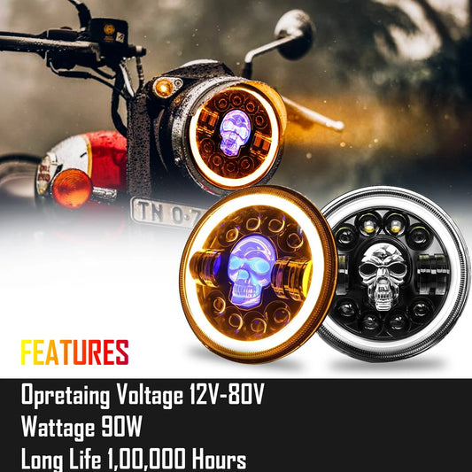 7 Inch Harley Skull Round Led Headlight Fits in Royal Enfield All Models, Mahindra Thar (12V-80V 75w)