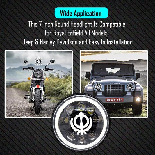 7 Inch Round Headlight Compatible with Royal Enfield, Jeep & Harley Davidson (Khanda DRL) (12V-80V 75W)